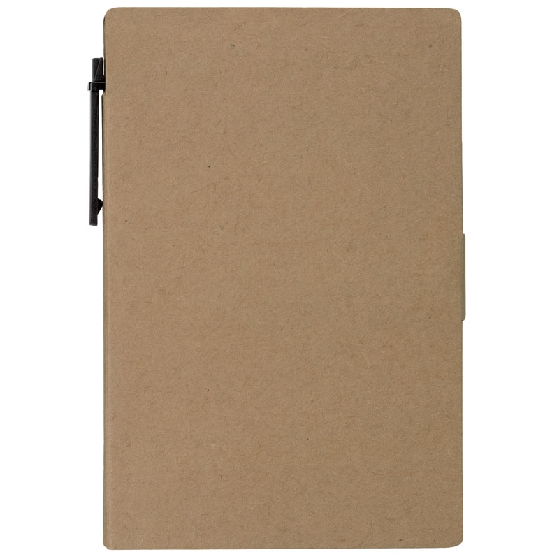 This natural note book is includes a note pad, 3" x 3" sticky note pad, 5 colored flags, and a ballpoint pen.