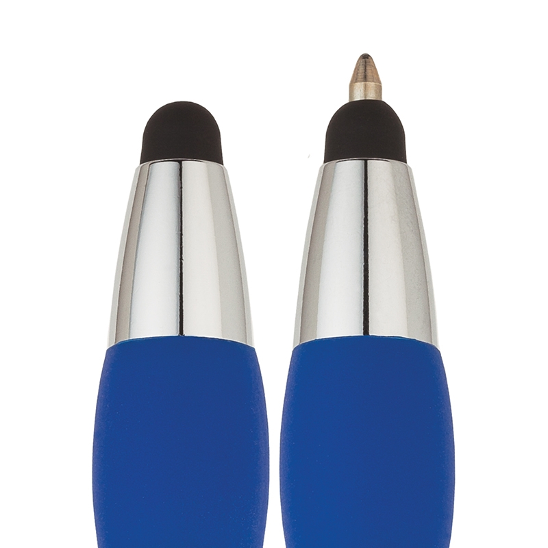 Build your own pen by choosing from 12 colors for your cap, clip dot and grip. This plunge-action ballpoint pen has a brass cap, chrome clip and trims soft rubber grip, and a capacitive stylus tip that works with touch screen devices. Pen refill extends through stylus tip.