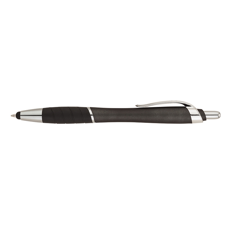 Plunge-action ballpoint pen features a metallic color barrel, black rubber grip with color oval accents, weighted barrel and chrome clip and trims. It also has a capacitive stylus that works with touch screen devices. Pen refill extends through stylus tip. Extra smooth glide black ink.