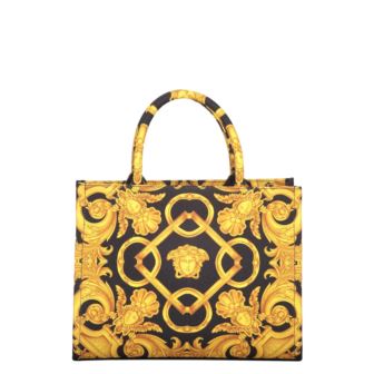 Sophisticated and versatile, this Versace Jacquard Canvas Tote Bag is a bold statement of everyday luxury. Crafted in Italy from jacquard canvas with all-over logo detailing, the bag is accented with rich black leather inserts and gleaming gold-tone metal hardware. It features two structured top handles for easy carrying and a detachable strap for over-the-shoulder or crossbody styling. The cotton-lined interior includes a zippered pocket for secure storage, combining elegance with functionality. Whether for work or weekend outings, this structured tote makes a polished and practical companion. A dust bag is included for long-lasting care. Dimensions: 11" W x 8.3" H x 5.5" D.