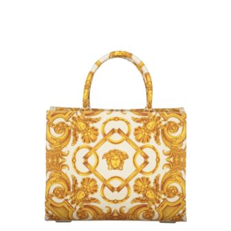 Timeless and refined, this Versace Jacquard Canvas Tote Bag in ivory brings sophisticated charm to everyday styling. Made in Italy from high-quality jacquard canvas with an all-over logo motif, it's elevated with tonal leather accents and gold-tone metal hardware for a luxurious finish. The structured design features two sturdy top handles and a removable strap for hands-free wear. The interior is lined in soft cotton and includes a secure zippered pocket for smaller items. With a compact yet practical shape, this tote is ideal for day-to-day use and transitions effortlessly from casual to dressy. Comes with a dust bag for storage. Dimensions: 11" W x 8.3" H x 5.5" D.