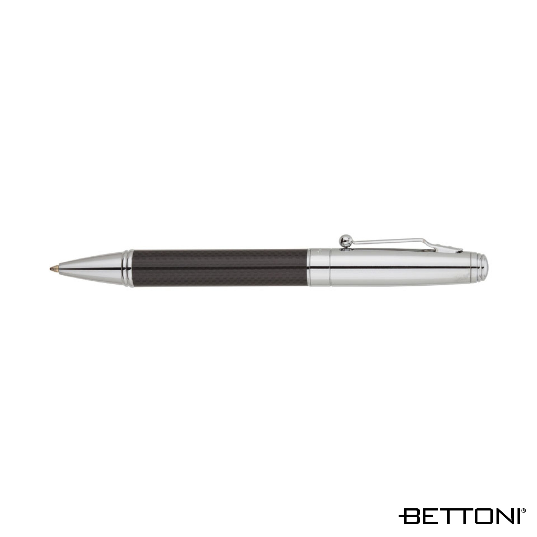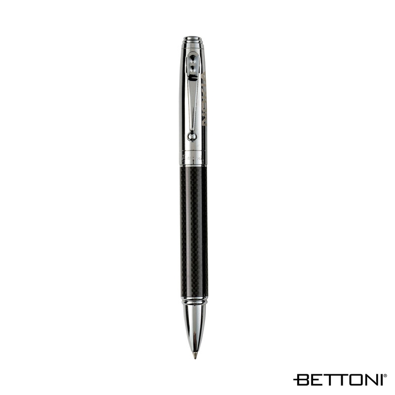 Twist-action ballpoint features a brass cap, a high-gloss carbon fiber barrel, and chrome pocket clip and trim.