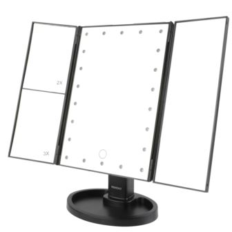 Light up your makeup routine with the LED Lighted Tri-Fold Mirror by Vivitar. 72 LED lights with three different light settings ensure you'll never do your makeup in the dark again, and five mirrors on adjustable tri-fold doors allow you to see yourself from every angle. Choosing your lighting is easy with our touch sensor technology: simply tap to switch between warm, natural, and cool lighting and bask in the glow! With 1x, 5x, 10x, and 15x magnification mirrors, you can get a closer look at your reflection than ever before. A built-in storage compartment at the base makes staying organized easy, and the foldable doors make this mirror perfectly compact.