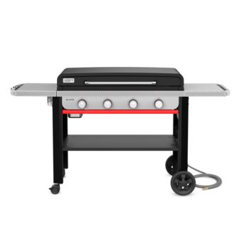 Step up to a premium flat-top grilling experience with the sleek and stylish Slate 36'' Rust-Resistant Griddle. Start sizzling fajitas, smashing burgers, and stir-frying right out of the box on the pre-seasoned carbon-steel cooktop that stays ready, not rusty, use after use. This griddle quickly reaches over 500F and provides even heat across the surface. Wind guards prevent the burners from blowing out, and the cooktop is set close to the burners to keep the temperature steady. Four independently controlled burners allow for multi-zone heat, so you can cook perfect pancakes on low and crisp up bacon on high all on the same cooktop. No use of coatings means you can use metal tools to flip, press, and scrape without worry. Keep your griddle gear near with a variety of accessories that snap onto Weber Works side rails. The left side table folds down to save space when you're done.