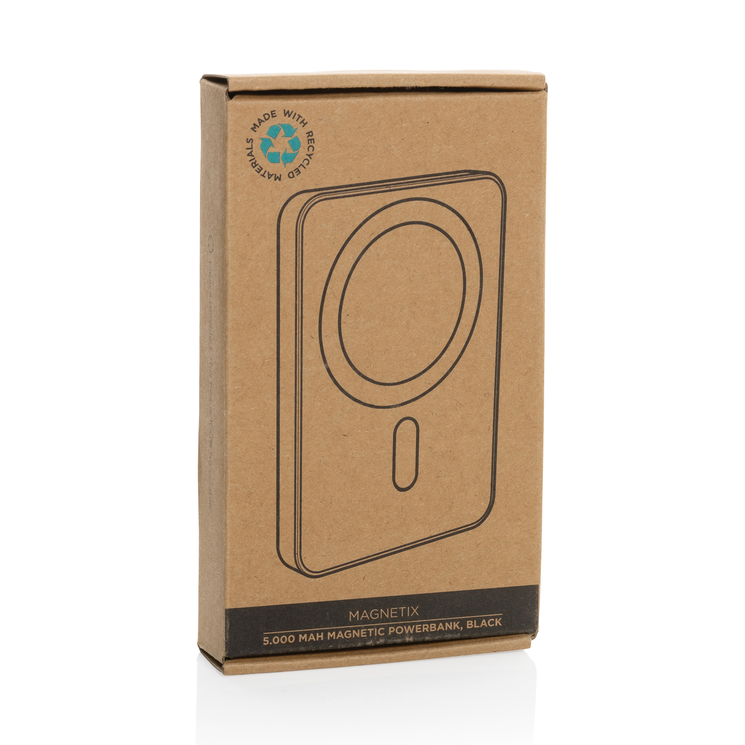 5,000 mAh pocket size powerbank with 5W magnetic wireless charger with a case made out of RCS certified recycled ABS plastic. RCS (Recycled Claim Standard) is a standard to verify the recycled content of a product throughout the whole supply chain