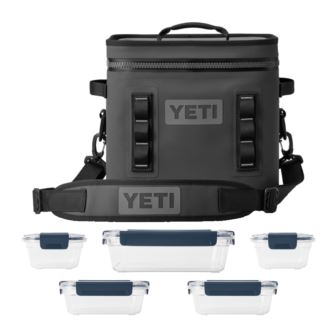 Meet the leakproof, tough-as-nails, carry-the-day soft cooler, the Hopper Flip 12. Its wide mouth opening makes for easy loading and access to your food and drinks. Its compact, cubed body means ultimate portability go off road, onto the water, and back again with this personal cooler. And its extreme insulation means your ice is staying ice. Kit includes one Large Yeti Food Container, one Medium Yeti Food Container, and two Small Yeti Food Containers.