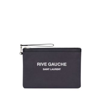The Saint Laurent Rive Gauche Zippered Pouch in Black is a sleek and versatile accessory that embodies the brand's minimalist aesthetic. Crafted from durable canvas, this medium-sized pouch features the iconic "RIVE GAUCHE SAINT LAURENT" logo printed in contrasting white across the front, making a bold statement. The top zip closure ensures the security of your essentials, while the interior offers ample space for daily necessities. A removable leather wrist strap adds functionality, allowing the pouch to be carried by hand or slipped into a larger bag. Whether used as a clutch for evening outings or as an organizer within a tote, this pouch combines practicality with timeless style, making it a valuable addition to any accessory collection.