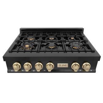 Luxury isn't meant to be desired - it's meant to be attainable. Designed in Lake Tahoe, USA, the ZLINE Autograph Edition 36'' Porcelain Rangetop with 6 Gas Burners in Black Stainless Steel and Gold Accents (RTBZ-36-G) provides a professional culinary experience by pairing unmatched performance with personalized touches. Encompassing limitless beauty, precision, and quality, the Autograph Edition Series creates a luxury look that will transform your space. Achieve ZLINE Attainable Luxury excellence with innovative features designed to enhance your kitchen's capability.
