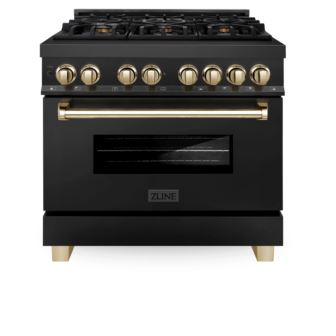 Luxury isn't meant to be desired - it's meant to be attainable. Designed in Lake Tahoe, USA, the ZLINE Autograph Edition 36'' 4.6 cu. ft. Dual Fuel Range with Gas Stove and Electric Oven in Black Stainless Steel with Champagne Bronze Accents (RABZ-36-CB) provides a professional culinary experience by pairing unmatched performance with personalized touches. Encompassing limitless beauty, precision, and quality, the Autograph Edition Series creates a luxury look that will transform your space. Achieve ZLINE Attainable Luxury excellence with innovative features designed to enhance your kitchen's capability.