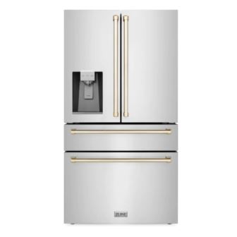 Luxury isn't meant to be desired - it's meant to be attainable. Designed in Lake Tahoe, USA, the ZLINE 36'' Autograph Edition 21.6 cu. ft Freestanding French Door Refrigerator with Water and Ice Dispenser in Fingerprint Resistant Stainless Steel with Gold Accents (RFMZ-W-36-G) provides a professional culinary experience by pairing unmatched performance with personalized touches. Encompassing limitless beauty, precision, and quality, the Autograph Edition Series creates a luxury look that will transform your space. Achieve ZLINE Attainable Luxury excellence with innovative features designed to enhance your kitchen's capability.
