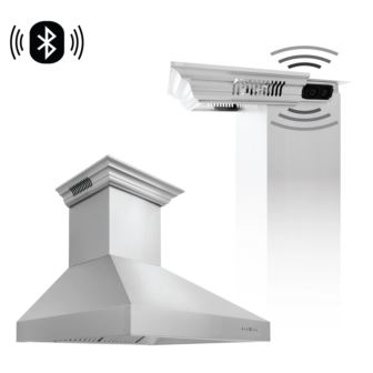 The ZLINE Wall Mount Range Hood with Built-in CrownSound Bluetooth Speakers transforms the seamless, elegant ceiling transition of ZLINE Range Hoods into a high-fidelity, wireless sound system, creating the perfect entertainment area for you and your guests. With CrownSound, you can pair your smart device up to 50 feet away for optimal access and control of audio in your kitchen. The high-performance 700 CFM, 4-speed motor provides all the power you need to quietly and efficiently ventilate your kitchen while hosting kitchen dance parties or listening to your favorite podcasts. With its classic 430 grade stainless steel, this range hood contains rust, temperature, and corrosion-resistant properties to ensure a durable vent hood that will last for years to come. Enjoy modern features, including built-in LED lighting for an illuminated culinary experience and dishwasher-safe stainless steel baffle filters for easy clean-up. This wall mount mount range hood has a ducted vent with easy, simple installation. Achieve a functional, modern upgrade that is perfectly harmonized in your favorite ZLINE Range Hood designs. ZLINE continues to revolutionize the industry by providing our customers with Attainable Luxury. ZLINE proudly stands by the longevity and durability of their range hoods alongside its 3-year manufacturer parts warranty.