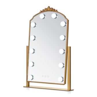 Gilded glow, beautifully refined. This scalloped arched vanity mirror with optical-quality 1X glass boasts twelve radiant LEDs for flattering, illuminating light. Choose between Warm, Daylight, or Cool light settings and fine-tune with touch dimming. The expansive 12'' x 19'' crystal clear view and clean plug-in design keep your routine polished and effortlessly luxe.