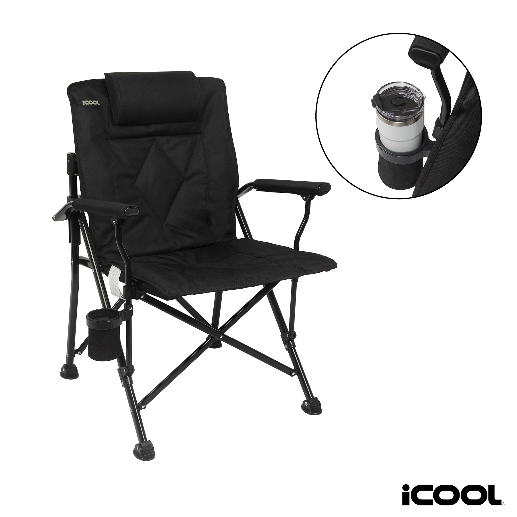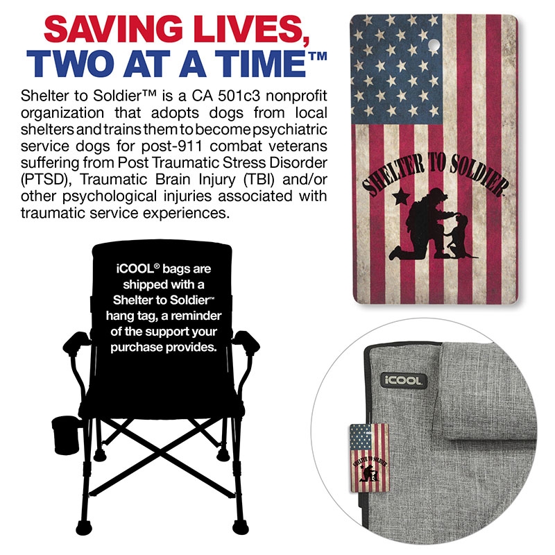 The iCOOL Twin Peaks Portable Camping Chair provides reliable and comfortable seating wherever your adventures take you. Made of durable 600D Polyester, this portable chair features a foldable cup holder and an included carrying bag for easy transportation and storage. Its padded back, seat and arms and detachable pillow provide comfort and support for a relaxing rest at the beach, the trail, or really anywhere you'd like to stop and enjoy the view. Its reinforced steel frame is well constructed and tested to hold up to 450 lbs. A portion of all proceeds is donated to Shelter to Soldier™, a non-profit organization that rescues dogs to train as service animals for veterans in need.